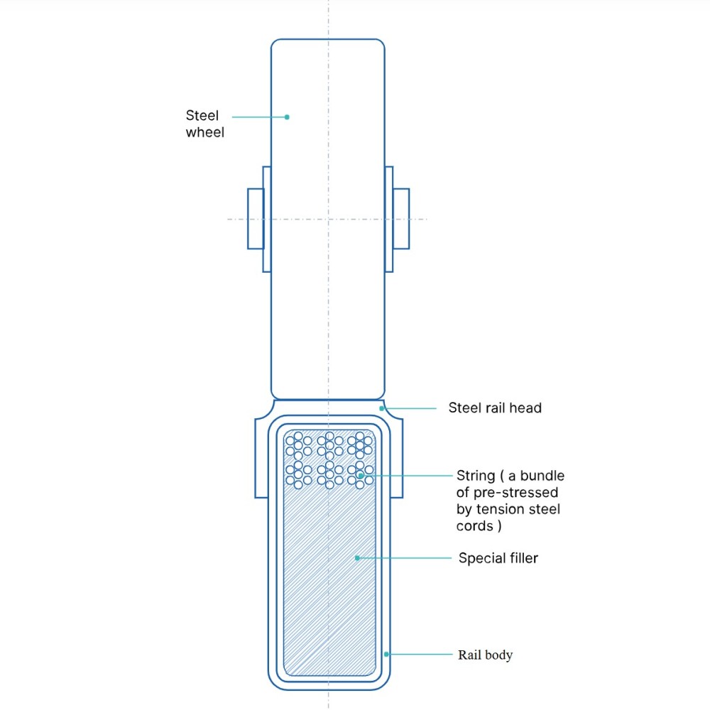 Transport and Infrastructure Solutions by Kathmandu Podway utilize advanced technology for constructing next-generation pre-stressed transport overpasses, with the string rail as the core component. This string rail consists of a steel or composite beam housing a core bundle of pre-stressed tensioned wires (strings) and is fitted with a rail head. Passenger and cargo electric vehicles on steel wheels—known as uPods—operate automatically along this rail at speeds up to 150 km/h, with potential future speeds reaching 500 km/h.