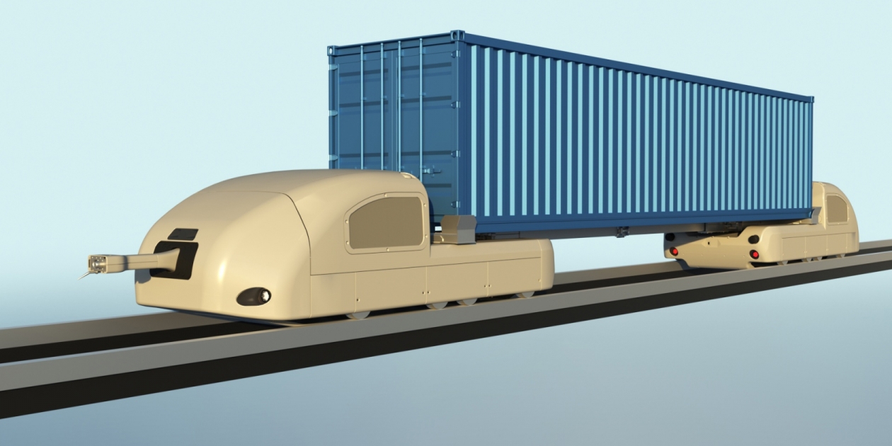 Double-rail suspended cargo uPod intended for transportation of bulk, piece, liquid, dangerous and perishable cargo. Loading and unloading of uTruck can be prformed automatically. The rail electric vehicle is designed for use in industrial facilities, ports and mining sites.